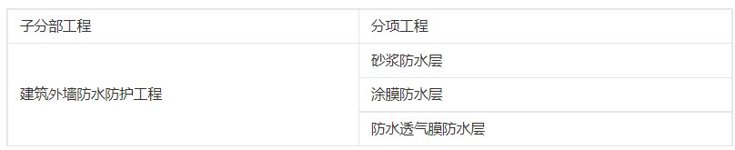 4、外墻防水防護(hù)工程應(yīng)按裝飾裝修分部工程的子分部工程進(jìn)行驗(yàn)收,外墻防水防護(hù)子分部工程各分項(xiàng)工程的劃分應(yīng)符合下表的要求。